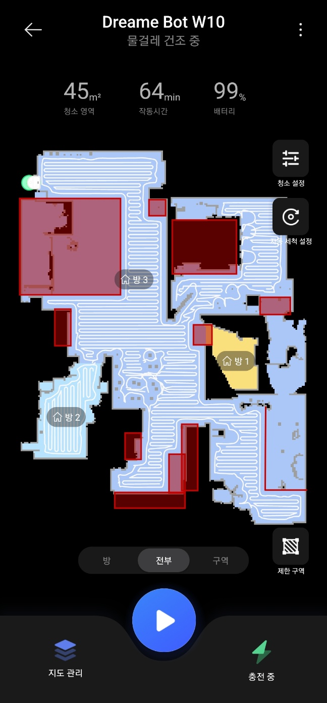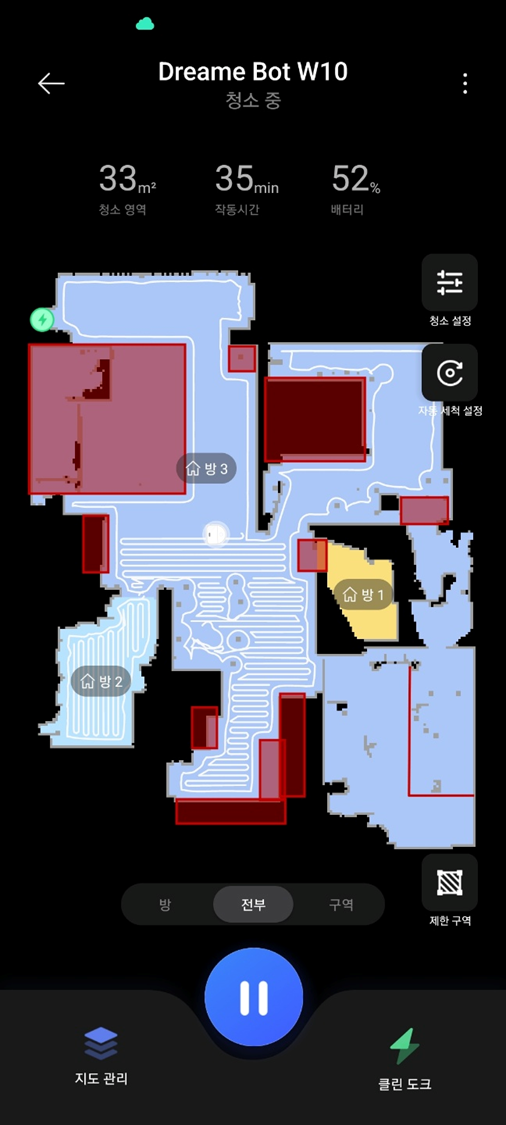 빨간색으로 표시된 구역은 제가 직업 제한구역을 설정한 곳인데요. 카펫의 경우 모서리에서 걸리거나 물어 들어가는 경향이 있어서 카펫은 제외하였습니다. 화장실 앞 발판 있는 곳, 부엌 발판 등은 카펫과 같은 이유로 제한구역 처리하였고, 현과 입구 쪽도 중문이 있는데 턱을 계속 올라타길래 제한구역으로 설정하였습니다.
