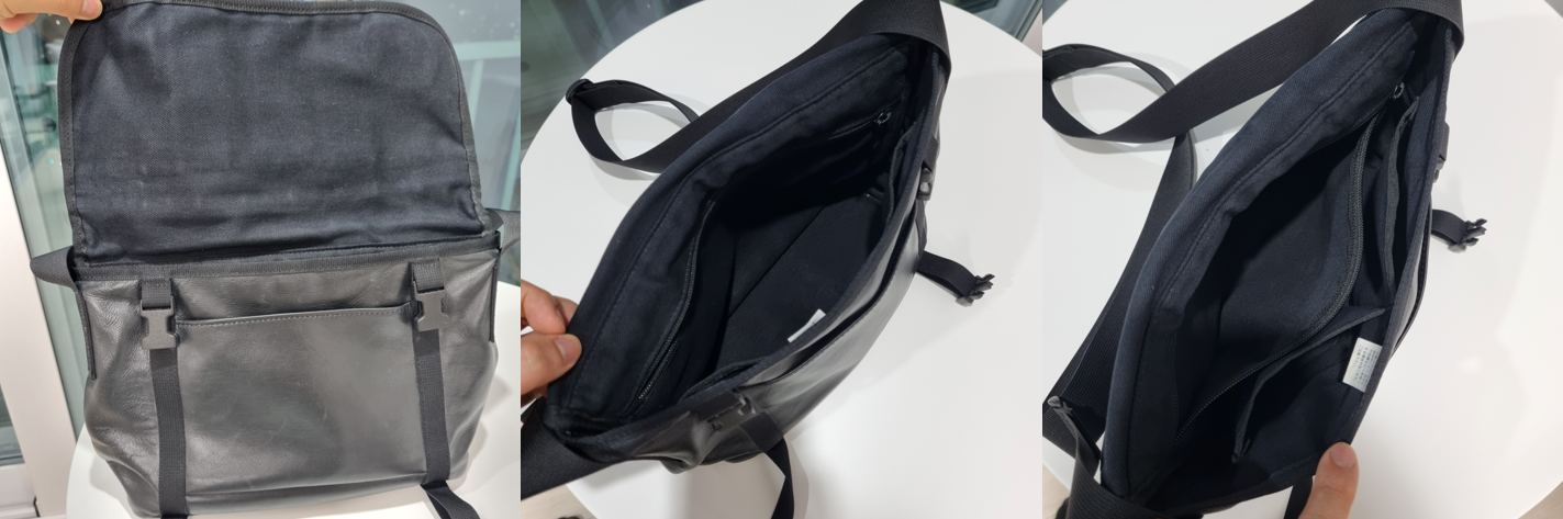 가방 내부입니다. 가로길이는 갤럭시 S23 모델 2개만큼의 길이이고 총 4개의 별도 수납공간이 있습니다.